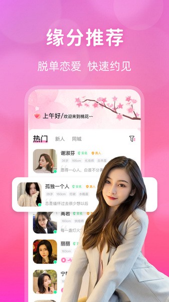 桃花交友同城视频约会是可以与同城陌生人恋爱聊天的交友 APP ,不用加好友,就能在线约会交友找对象。在这里,您可以倾诉心声、分享快乐,默默拉进彼此的距离,相中命中注定的那个TA。
