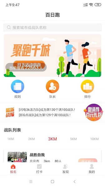 百人战队陪你一路坚持。1000+具备多年跑步和跑团管理经验的队长,来自天南海北的队友,战队相册记录……人气PK,完赛率PK,为团队而战,排行TOP的战队可获得优胜奖金