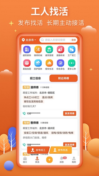 2、点击求职找活,可查看最新发布的工人找活信息,有需求可以电话联系师傅;
