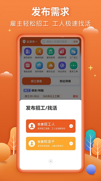 2、一键发布招工、找活,方便快捷,招聘者的贴身之宝,让找工人从此就是这么方便,工人党的福利、招聘者的助手。