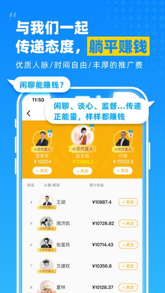 想买保险不知道从何下手,怕投错保花冤枉钱,那就来看看这款专门为网友在投保方面答疑解惑的应用小贝智友吧。使用该款应用,通过每位用户个人情况进行数据分析,为每位用户私人订制6份专属报告,在性价比,专家推荐,保障的全面性上详细划分,长达六小时专人讲解,还有百万年薪精算师为用户精打细算,致力于让用户少花钱,多保障,不吃亏。小贝智友更是一款社交软件,在这里,有各色各样的人群,你可以找到自己的同类人,与他们亲密交流,尽情的释放自己,畅所欲言,不管是和他人闲聊,谈心,监督都能得到丰厚的推广费,让用户得到了优质人脉的同时,随时随时的赚钱,聊得越多赚的越多。如果你对保险方面有疑问,不用再去大费周章的去保险公司资讯顾问了,小贝智友就能解决你的需求,快下载吧。软件功能