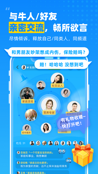 除了保险功能,它还是一款社交软件。你可以在这里认识各种各样的人,聊天谈心还能赚钱,聊得越多赚得越多,这挺吸引人的。特别是对于那些想买保险又不知道怎么选的人来说,这个应用可以省不少事,还能避免被坑。而且他们的赔付计划也很实在,不满意就赔钱,服务不到位的话最高能补偿20倍咨询费,这点保障做得很好。