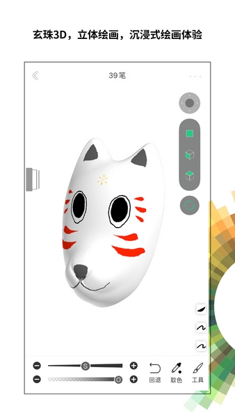 包含玄珠画板所有功能,还提供3D模型表面绘画(画彩蛋、画花瓶、画星球…),360度场景绘画(模型内表面绘画,画星空、画房间…),罗盘控制(模型转动/缩放/平移/快捷3视图切换/转动锁),动画设置,3D场景设置,背景音乐设置,3D效果预览,3D贴图导出,自定义模型设计工具,3D作品分享到微信小程序等功能。