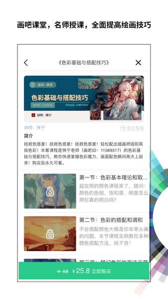 特邀画吧大触老师录制视频课程,竖屏格式,包含老师手部操作细节,在学习绘画知识的同时掌握如何用手指在手机上画画的秘诀,目前已经推出的课程包括零基础二次元头像、二次元Q版人物、二次元服装设计、古风厚涂人物、场景基础、人体基础、表情包设计等,课程库还在不断扩充中,希望能够帮你提升画技。