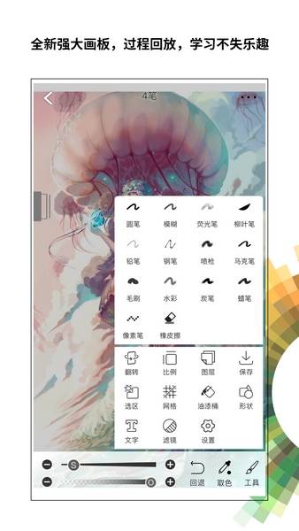 支持4096x4096画布,无限绘画过程记录回放,默认画布150个图层,自定义笔刷,笔刷商店,正片叠底/滤色/发光等图层混合模式,锁定透明度,液化,钢笔/铅笔/水彩笔/炭笔/毛刷等十多种仿真画笔,锐利柳叶笔/模糊柳叶笔/柳叶橡皮擦(指绘神器),形状工具(方/圆/直线),文字工具(多种字体),油漆桶,选区变换,翻转可画,画布旋转,滤镜,网格,色盘色环取色,图片导入(仅自己可见),原图导出,云草稿,严格的创作属性标签制度(原创/二创/临摹/写生),涂鸦接龙,绘本(图文混排)。