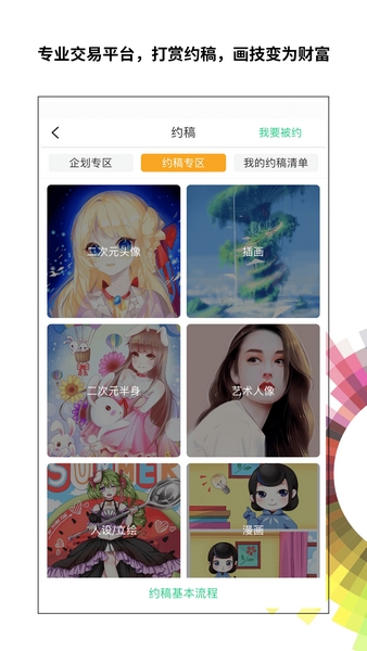可以购买画吧作品版权进行珍藏;可以向喜欢的画师约稿;也可以在画吧发表自己的企划需求,由画师竞标接单创作。