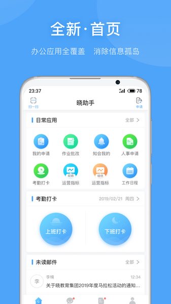 晓助手安卓系统融合了包括运营、办公自动化、人事等在内的企业内部协同事务,