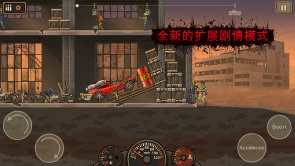 这是一款末日逃亡的跑酷游戏,游戏目标简单明了就是一路向前,越过障碍物和僵尸,不过战车基本上都是撞过去的,我相信不少人都会觉得把僵尸撞得肉末飞溅是这款游戏的非常刺激的画面。游戏的界面和操作也是很简单的,这非常适合新玩家上手。进入游戏界面后,在屏幕的左下角是调节战车重心的两个按键,在中部是战车的仪表,上面显示时速、油量和推进器的燃料量,在最右侧是油门,在战车升级加装推进器后会有一个推进器的油门按钮出现。通过游戏中战车达到的距离获得金币来购买或升级战车的配件,已使战车能够达到更远的地方,直至到游戏关卡的终点,在通过一个关卡后会获得更强大的战车,来应对之后更加恶劣和复杂的道路。