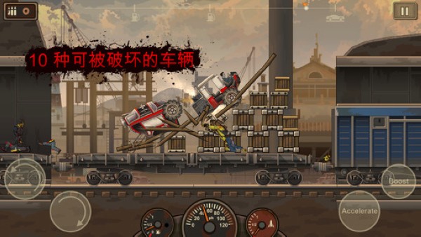 在战车行进的过程中,路上会充满了障碍物和僵尸,到后面的关卡会会出现大型的僵尸和更为坚硬的路障出现,这些都是为了阻止战车的前行,尽可能躲开或飞跃这些障碍物是到达更远距离的不二选择。在跑过几次后会对关卡的地形有一个熟悉,寻找一个合适使用推进器的路段是取得胜利的重要手段,这能够让玩家战车飞起来,小伙子,多攒点钱,让玩家的车飞起来吧。