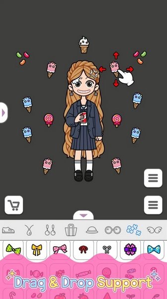 您可以通过拖放用户界面的支持随意放置衣服和物品。