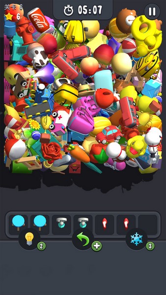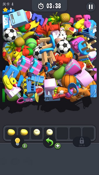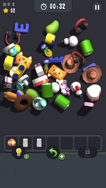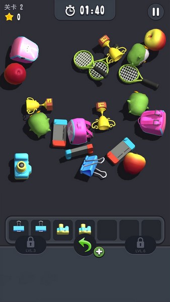 点点消除是一款规则很简单的消除游戏,玩家只需在关卡场景中连续找到三个相同的物体即可将其消除。每次点击这些物体就会被添加到格子中,如果多次没能实现消除,那么当格子被装满就失败了,因此还是很考验策略的。此外游戏中的元素丰富,包含了大量的物体,且随着关卡提升难度也会升级。
