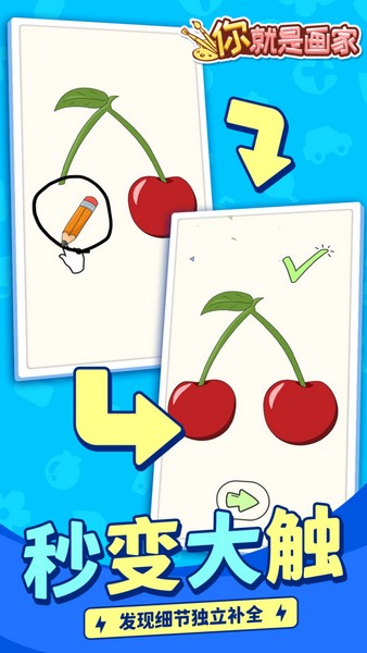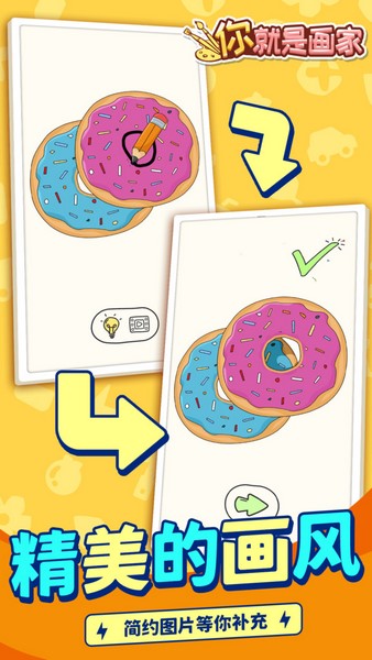 你就是画家是一款非常轻松简单的绘画游戏,玩家只需要根据关卡中的提示来进行绘画即可。关卡中的图形都是缺失的,而玩家要做的就是将缺少的部分补充完整,然后就能过关了。缺失的部分是有一个轮廓提示的,结合已有的绘画内容,可以很轻松地猜出来然后进行绘画,可以感受到画画的乐趣。
