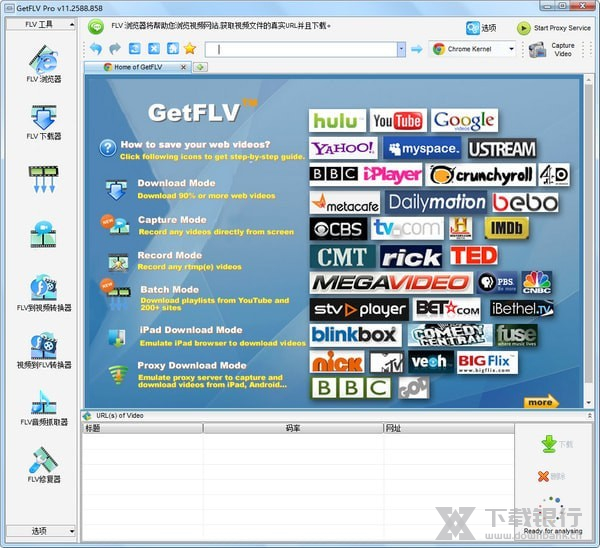 GetFLV Pro(FLV视频下载器)是一款集FLV视频下载、管理、转换并播放的实用软件,在这其中有着一个专门的网页浏览器,可以专门用来浏览所要查询的视频站点,每当打开一个视频播放地址时,GetFLV Pro会自动的检测出真实的地址并且给用户提供下载的功能,并且除去下载的功能以外,还有在着其他的功能,比如转换FLV、修复FLV、提取FLV音频等辅助功能,让用户使用起来没有压力。