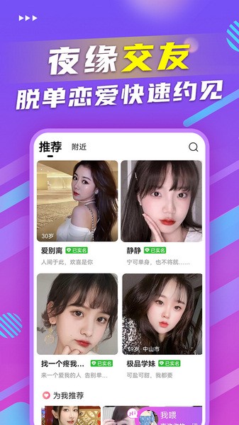 同城附近陌生人,聊天、交友、约会、恋爱的社交平台。24小时在线甜言蜜语聊,附近单身异性,聊聊人生、聆听心声。以视频、语音、文字等多种方式,多场景为上千万用户创造更多恋爱机会,帮单身男女找到自己的理想对象。来夜缘,不陌生!