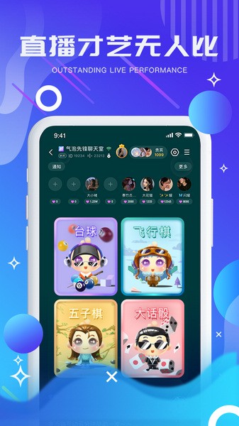 气泡音符app是一个多功能的社交交友软件,在这里大家可以通过语音来与各种各样的人来进行连接连麦交友,大家可以一边玩游戏,一边来语音进行交流,在这里大家可以找到与自己志同道合的好友,幸运的话也许在这里可以找到自己未来的另一边!此外大家在连麦社交聊天时,还为大家提供了许多搞笑的变声特效,各种音效可盐可甜,风格多变,感兴趣的用户们快来下载使用吧!