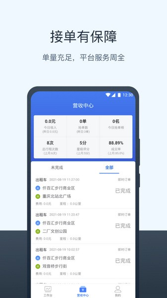 页面简洁,使用一键上手;多个渠道,多点收入;安全合规,全天派单,订单可选。