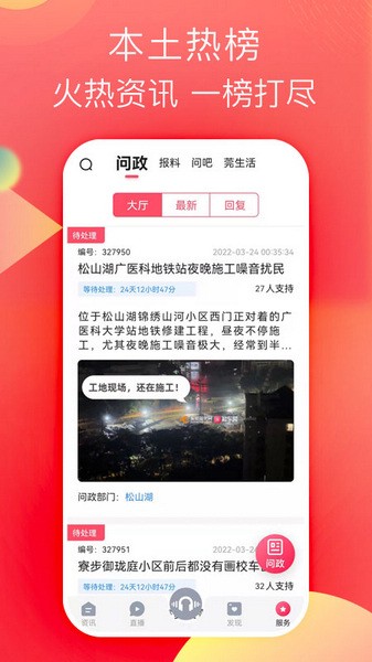 知东莞app是一款能够为东莞当地的市民们带来更便捷的生活体验的软件,除了有大量最新最热的本地资讯之外,还有各种短视频和广播电视节目,大家随时随地都能够打开知东莞app来阅读和观看。此外,知东莞上还提供了大量的本地服务,包括问政和报料等多项功能,大家只需要反馈自己遇到的问题,平台上就会有工作人员及时回复并公开处理结果,让大家在东莞的生活变得更好。通过该应用,用户可以随时随地收看东莞相关文章和视频,及时了解本地的最新信息和政府部门的回复。这款app还提供了丰富的视频互动功能,让用户在使用过程中获得更好的体验。作为一款集成了多项功能的综合性应用程序,知东莞app为市民提供一个便捷而丰富的社交互动平台,带来更多便利的同时让用户便捷了解东莞的各种生活内容,随时随地记录生活中的精彩瞬间,享受到各类特色功能带来的乐趣。
