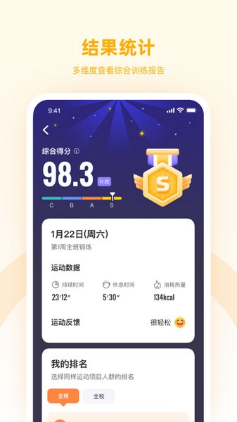 热门项目、组合训练、自选运动,快来挑选你喜爱的运动吧! 运动结果查看 查看包括运动时间、消耗热量、智能测分等多维度的锻炼报告,还能查看和全班全校同学的锻炼对比以及每个动作的表现详情。
