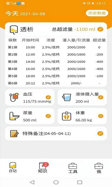 1、用户在软件中能够看到自己今天记录的透析超滤量、血压、尿量和体重等信息;