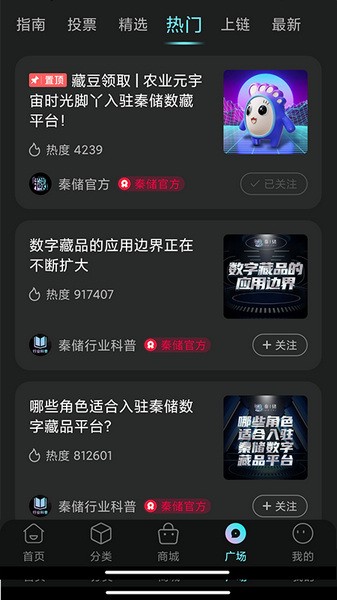 秦储平台中的藏品广场,是用户交流沟通、互动分享的重要桥梁。在藏品广场中,IP机构、艺术家、数藏服务商、收藏家、藏友等不同角色,可以发布热门话题、科普知识、个人藏品展示等高品质合规内容,也可以与他人交流收藏心得,沟通藏品转赠,体验元宇宙平台的社交属性。