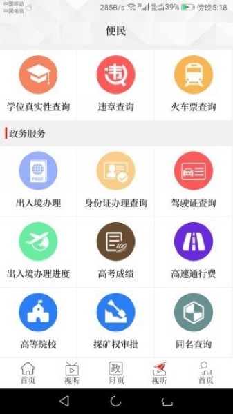 集纳各种生活服务,打造移动办事之窗,点击便民,即可办理水电、违章、火车票、出入境、住房公积金等各类日常生活服务的查询和缴费。