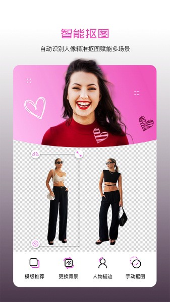 懒人修图提供了多种强大的编辑功能,包括手动抠图、智能抠像、照片换背景、智能抠物、图片编辑等。不论您需要进行图片的精细编辑、人像抠图,或者换背景,懒人修图都能满足您的需求。您可以通过应用内的智能抠像技术,轻松获得透明图像,还可以使用智能抠图功能来全自动抠图,无需繁琐的手动操作。此外,内置了丰富的背景模板,让您轻松实现图片换背景的效果。而且,您还可以对图像进行放大、缩小、移动位置、旋转等操作,以及美化图片。懒人修图的功能丰富多样,可满足各种编辑需求。