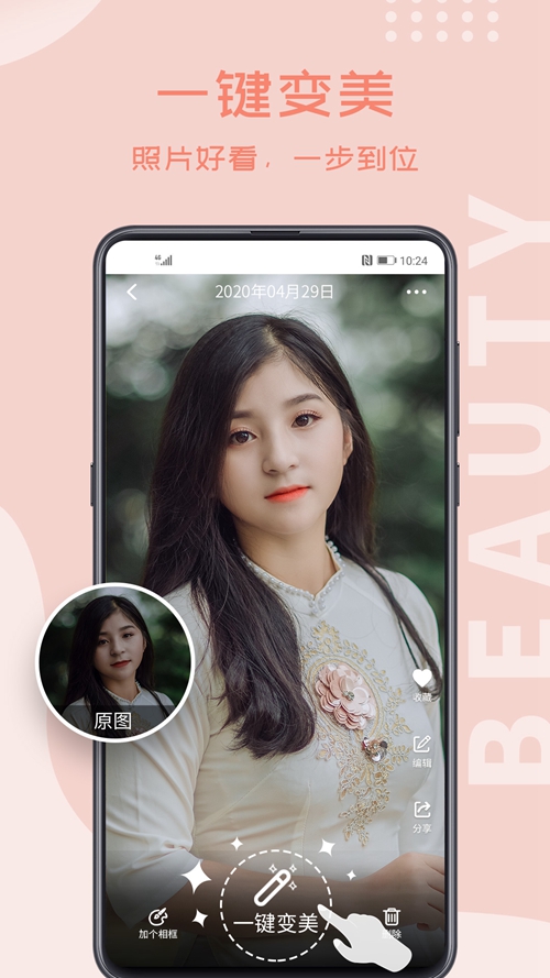 只需一键即可自动完成瘦脸、大眼、修眉、磨皮、美白、美肤