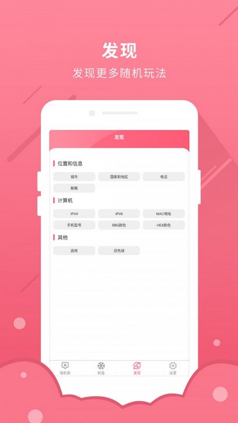 我们随机大全里还提供了各种各样好玩的随机功能。 随机城市、随机国家地区、随机手机号、随机邮箱、随机IP、随机MAC、随机手机型号、颜色等。