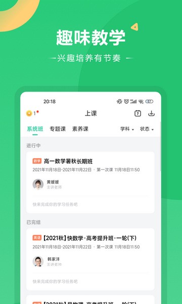 好课在线app是一款专门为中小学生们提供便捷的线上学习和培训服务的软件,丰富的课程资源和详细的知识点讲解能够非常好的帮助大家提高学习成绩,在课堂上也能够获得更好地表现,从而顺利跟上老师们的讲课节奏。此外,大家还可以将好课在线平台上自己认为有用的课程保存和收藏下来,方便随时回看和学习、提高。好课在线上的课程内容更新也非常的快,紧跟最新的考试大纲,系统化的专业课程安排让成绩提高变得毫不费力,能够为全国的学员们提供真正贴心的线上教育和学习服务。