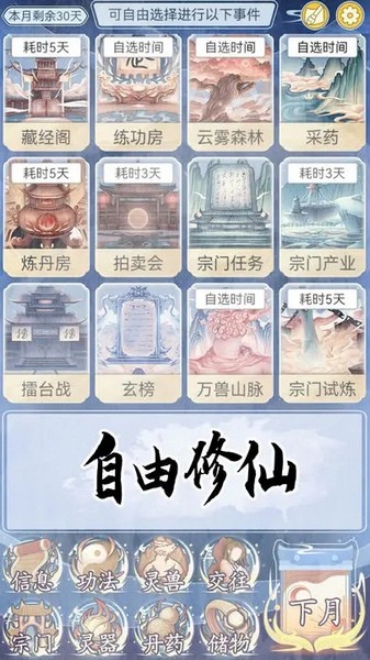 6. 修仙人生模拟器还有许多玩法模块将在游戏中可以体验到,比如宗门悬赏任务、秘境闯荡、拍卖会玩法等等