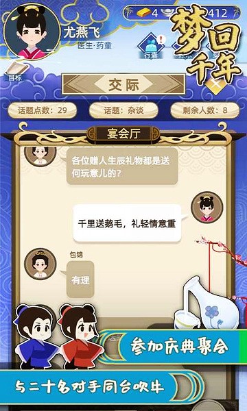 最近我发现一款超级好玩的游戏叫《梦回千年》,它让你穿越回古代体验不一样的人生。游戏里你可以从小孩开始,选择不同的性别和职业,体验各种古代生活。无论是成为大官还是富商,甚至是做个知书达理的大家闺秀,每种选择都会影响你的人生轨迹。