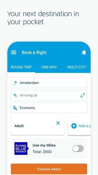 选择一个航班并在荷航应用程序中预订机票。您想为将来的旅行节省时间吗? 将您的个人详细信息直接保存到您的个人资料中。更妙的是:还可以使用智能手机扫描您的护照,一次上传您的所有联系信息。
