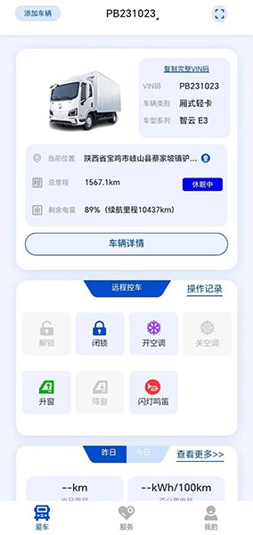 3、车辆数据:车辆管理、车辆定位、历史轨迹、里程能耗、指示灯查询、车机状态查询、服务站查询、运营证服务商查询、故障码查询、驾驶日记等。