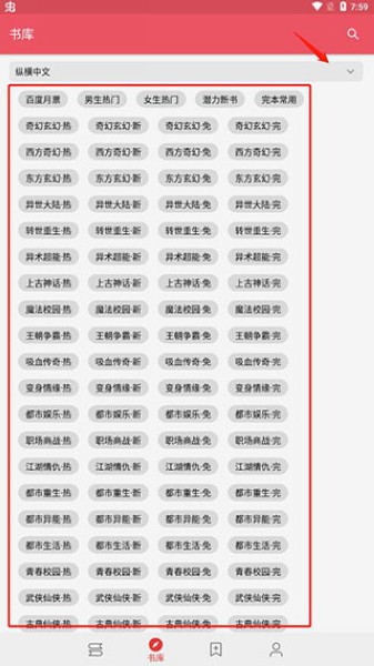 1、先下载好喵喵追书app,下载完成后打开app,在书库中找到自己平时爱看的平台。