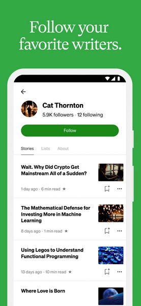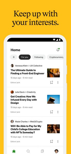 创建您的帐户中,然后翻阅您的个性化阅读列表,定制的基于你关注的人对介质的写入,读取,并建议您的利益。如果您正在寻找新的东西来读,头部探索的专题内容的旋转选择。