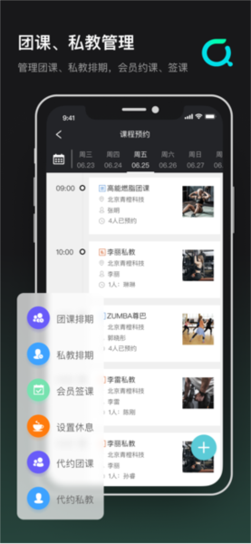 管理团课、私教、自主训练及商品售卖等业务