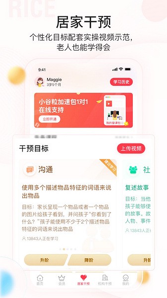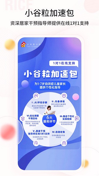 3、「在线指导」邹小兵、袁巧玲、华又佳、曾松添等国内外一流专家,结合AI,为每个1-7岁的谱系娃家长量身打造个性化、易操作的居家干预方案,并有资深康复师1对1提供在线指导。