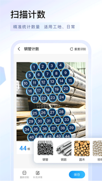 选择计数类型,拍摄或相册导入进行扫描计数,系统智能识别图片中的数量,支持计算钢管、钢筋、盘扣斜杆、轮扣、方管、圆木、方木等。