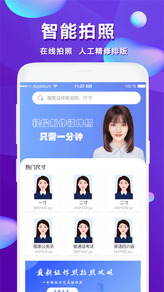 3、多种规格:目前已支持500多种专业证件照,满足大部分证件照拍摄需求