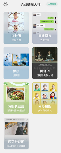长图拼接大师app是一款在手机上就可以轻松进行竖拼长图、横拼宽图的图片拼接软件。除了简单的横拼竖拼长图之外,软件还有多种模板样式可选的海报组合与网格拼接,更支持对于长聊天记录的智能去重拼接和电影综艺的台词拼接。近期还推出网页长截图的功能,只要输入网址,长图拼接大师即可自动对网页进行长截图。在图片拼接时,软件还可以对其中的某张图片进行简单的剪裁和旋转,更有多种边框样式和边框厚度可选,图片顺序也可以拖动调整。拼接处理完成的图片还可以一键保存到手机本地,或者快速分享到任何社交平台。操作简单,上手快,强烈建议人手一个。