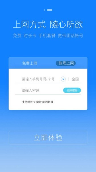 【多种账号登录】除免费上网外,更支持电信手机账号上网、宽带账号上网、时长卡账号上网等