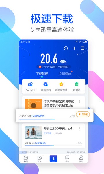 无需会员,独家p2sp技术,免费边下边播。同步pc离线空间,支持远程下载,dlna,实现手机与智能设备的完美融合。
