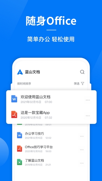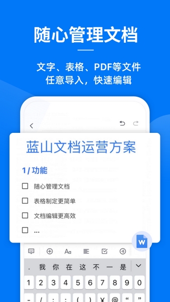 蓝山Office(蓝山文档)是一款Office办公软件,支持表格、PDF等多个文档格式,而且可以快速导入文档并进行管理,在管理界面还提供了筛选和搜索工具来帮助用户在大量文件中快速找到目标。此外软件也有强大的编辑功能,在手机上也很方便操作,让用户 可以随时随地编辑文档,让办公地点不受拘束。