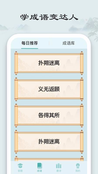 3、挑战成语积累量,每日答题闯关学习,轻松检测您的成语积累情况;