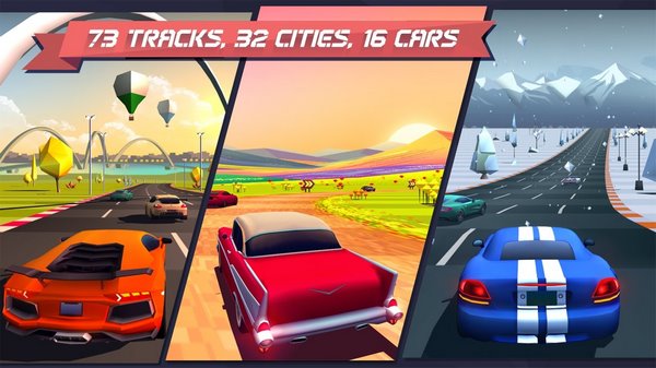 5、原创的背景音乐和充满乐趣的游戏跑道,在各种地形中尽情挥洒激情,全力竞速吧