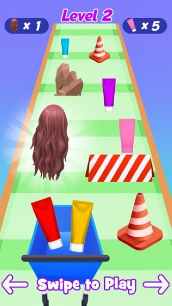 潮流彩虹染发沙龙是一款非常有趣的闯关跑酷类游戏。在这款游戏中玩家将作为一名美容店的理发师,为客人们改变头发造型,而客人们的要求各有不同,所需要的道具也都不一样,而这些道具的获取则需要玩家去闯关获得。在快速移动的跑道上散落着需要的理发工具和障碍物,玩家需要在躲避障碍的同时拿到需要的工具。