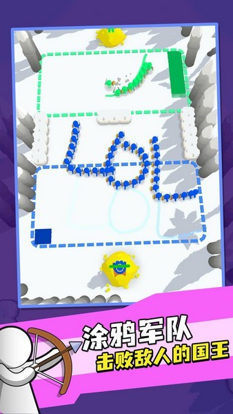 涂鸦输出是一款比较简略的战争类游戏,玩家只需要在地图上画出自己的部队即可开始战斗了。当然也不是乱画的,因为兵力是有限的,而且每一关的地形也会发生变化,我们可以利用地形来画出不同的部队阵型。另外游戏的胜利方式是击败敌方的国王,所以有时候巧取国王首级也是可行的。此外游戏中还有多个兵种可以收集使用。