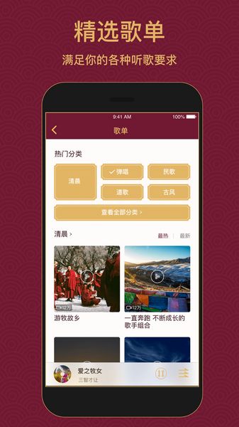 4、拥有多种歌单分类,包括清晨、弹唱、民歌、古风等,满足不同用户听歌要求;
