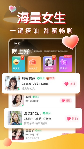 【线上交友】新奇的聊天交友体验,发现同在附近的妹子,好玩有趣的交友社区,发现与众不同的她,附近人约会交友互动,同城相亲找对象,畅快文字聊天,语音暖心交友,从此不孤单!