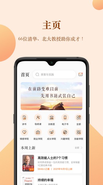 软件亮点包括有66位清华、北大教授帮助你成才,66位青年精英和才俊助你成长,还有企业家、创始人教你成功。通过“一书、一师、一课、一痛点”的方式,目标是每年学习50本书,和50位精英沟通学习。app里有200位专家讲解200本精华书籍,帮助大学生提升自我。